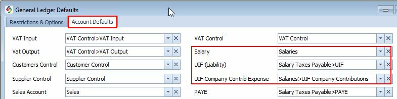 Go to Ledger > Account Options and select the Account Defaults tab. Select your Salary, UIF and LBS general ledger accounts. See below.