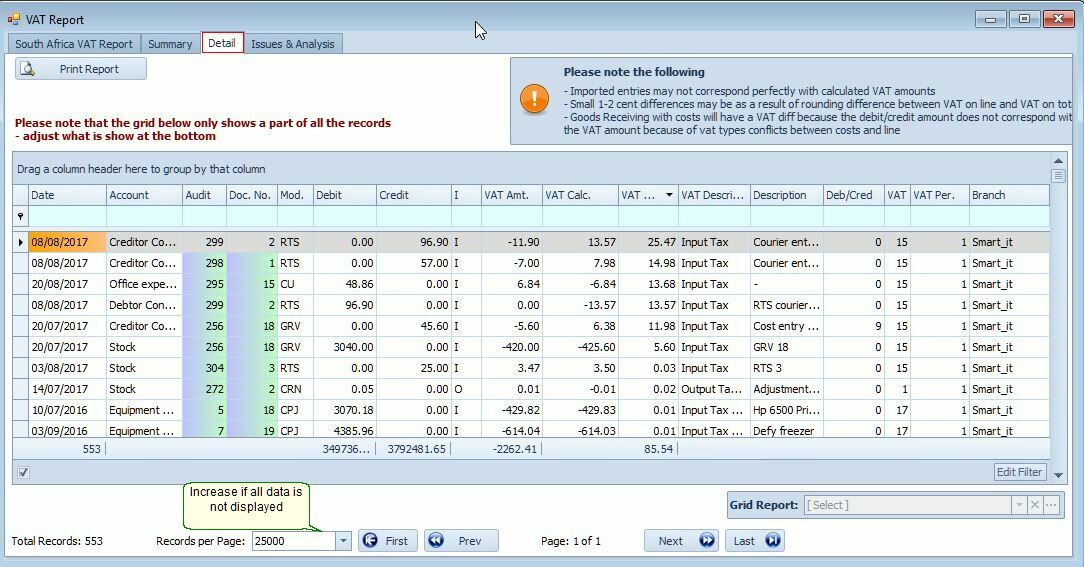 To see the detail of all the entries click on the Detail Tab, next to the Summary tab. You can filter the form to see for example only the Input VAT.
